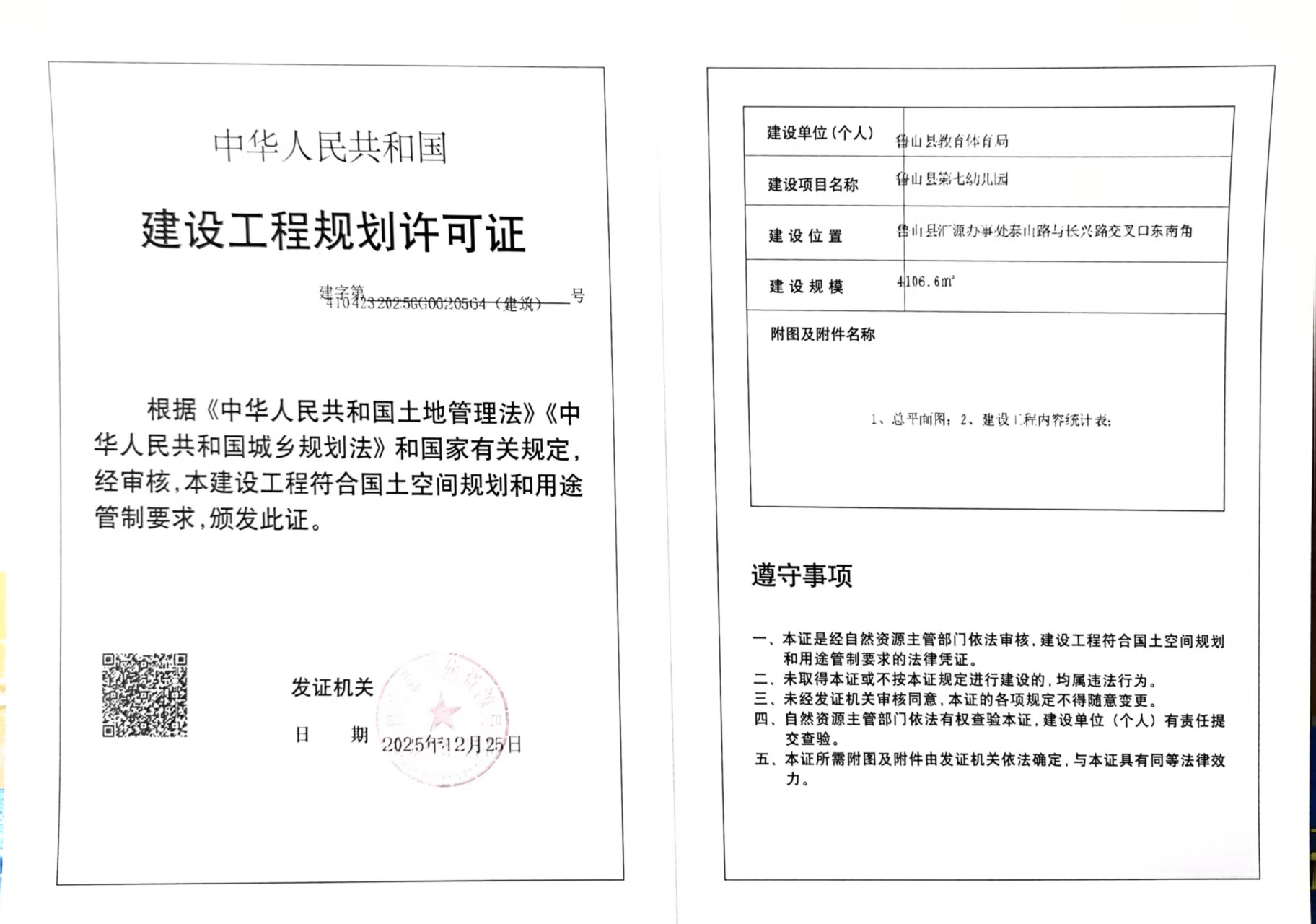 鲁山县第七幼儿园《建设工程规划许可证》批后公告