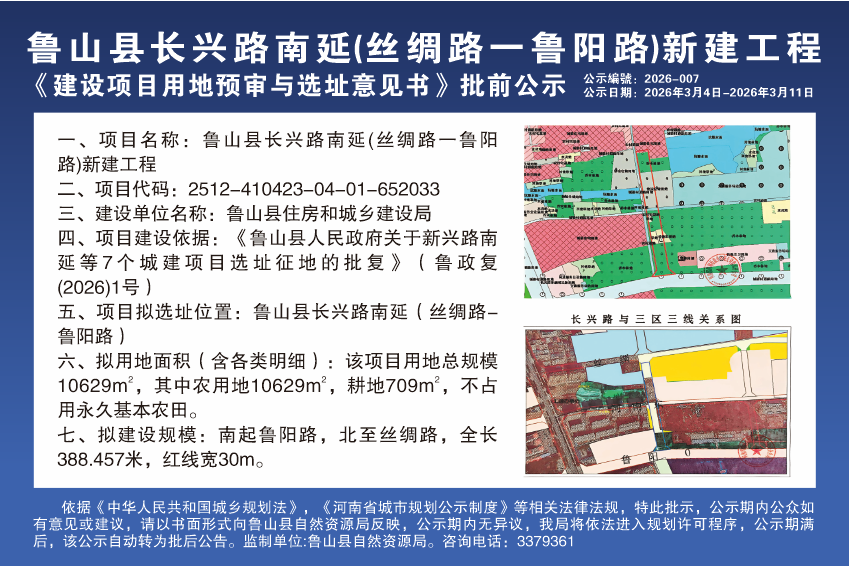 鲁山县长兴路南延(丝绸路-鲁阳路)新建工程 《建设项目用地预审与选址意见书》 批前公示