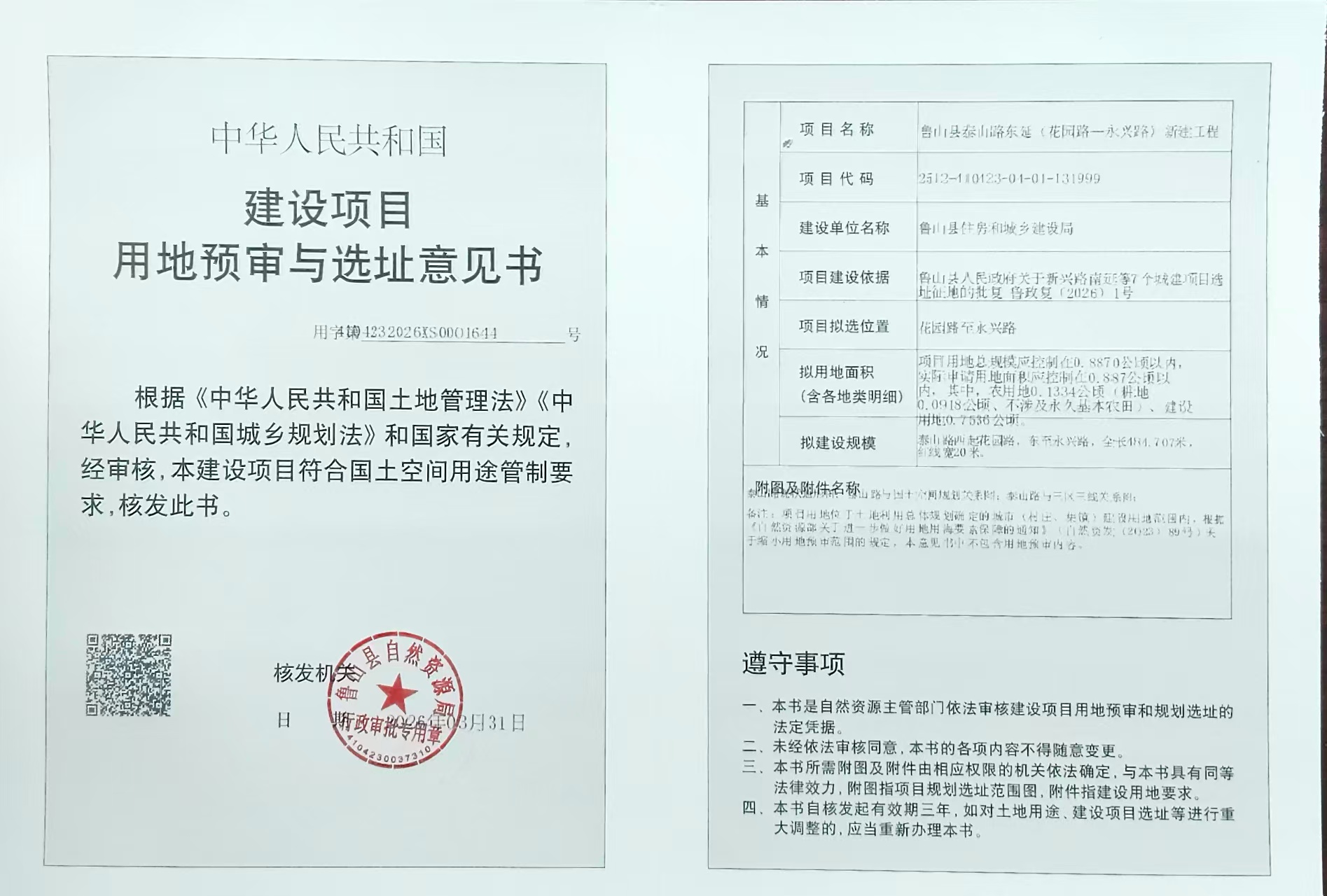 鲁山县泰山路东延(花园路-永兴路)新建工程 《建设项目用地预审与选址意见书》 批后公告