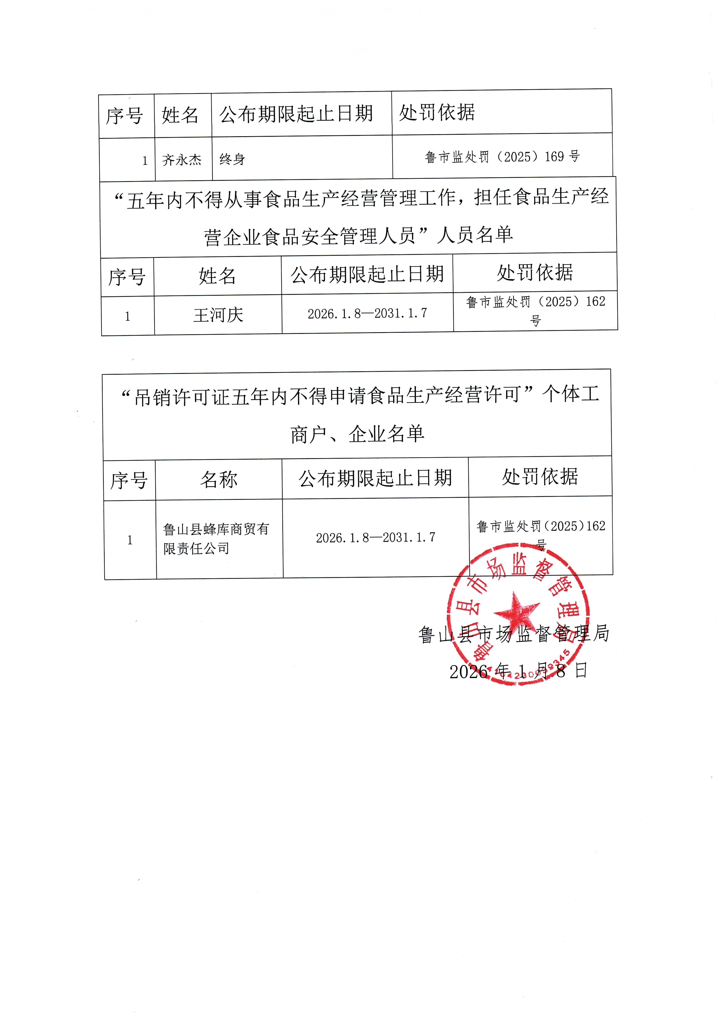 鲁山县市场监督管理局食品从业禁止公告(2026年度第一期)