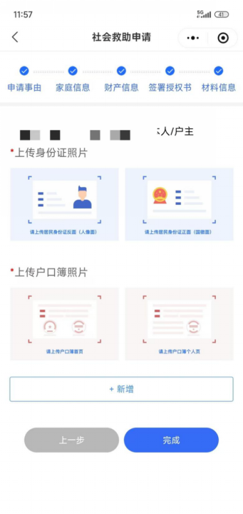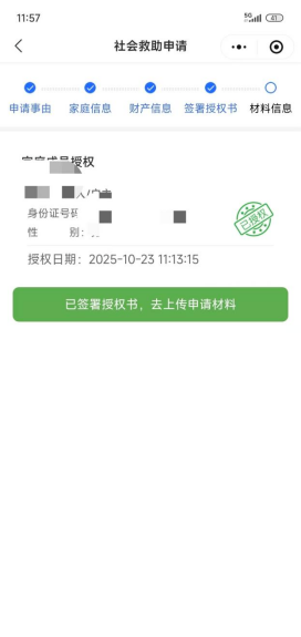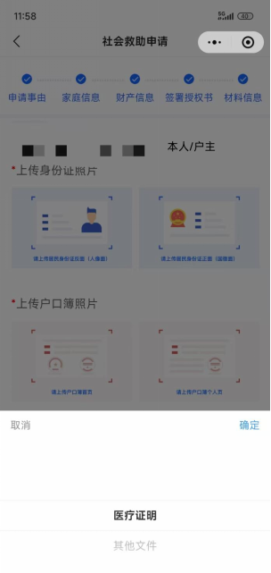 7.完成授权并上传申请资料。包括身份证、户口簿照片,以及与“生活困难原因”相对应的证明材料。如因病致困,则需上传近1年内的医疗诊断证明、医疗支出清单或仍在接续治疗的相关证明材料。完成后点击“提交”,即完成申请程序。