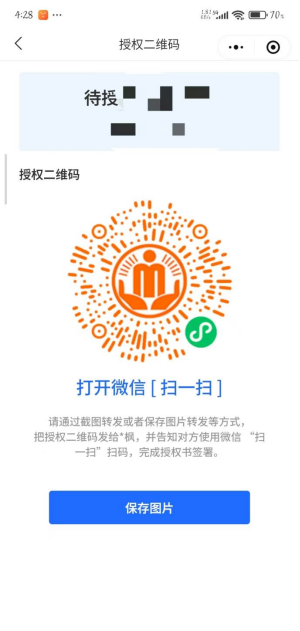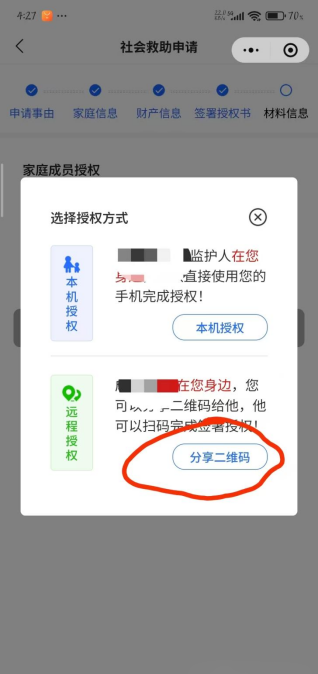 6.点击“下一步”进入“签署授权书”页面,在“家庭信息”页面(第4步),所添加的所有家庭成员均要“签署授权书”;待所有家庭成员均显示“已授权”才可进入下一步操作。若“家庭成员”未在身边,可通过点击“分享二维码”,将二维码保存发送给他人实现远程授权。