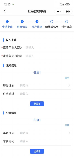 5.点击“下一步”进入“财产信息”页面。按照提示完善财产信息,其中“家庭年收入”为该家庭收入和非共同生活的法定赡(抚)养人的赡(抚)养费;“家庭年支出”为该家庭共同生活家庭成员的近一年内的医疗、教育、残疾康复等刚性支出。“住房信息”包括产权住房、宅基地住房等,住房地址需详细填写,方便后续入户调查。“车辆信息”如实填写。