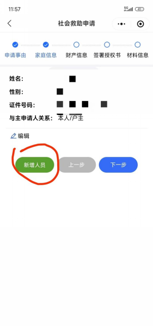 4.点击“下一步”进入“家庭信息”页面,点击“新增人员”,完善家庭信息。其中“家庭成员”包括:共同生活的家庭成员、法定赡/抚养人。