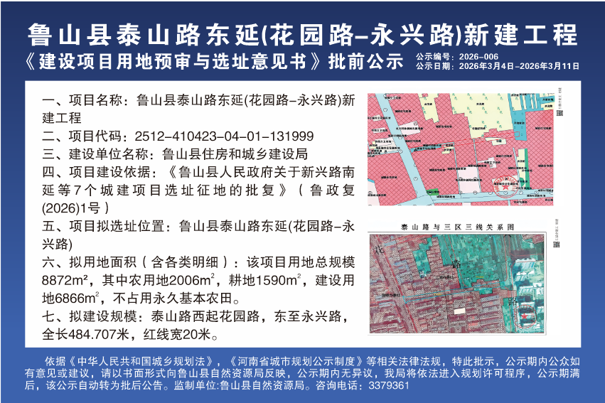 鲁山县泰山路东延(花园路-永兴路)新建工程 》建设项目用地预审与选址意见书》 批前公示