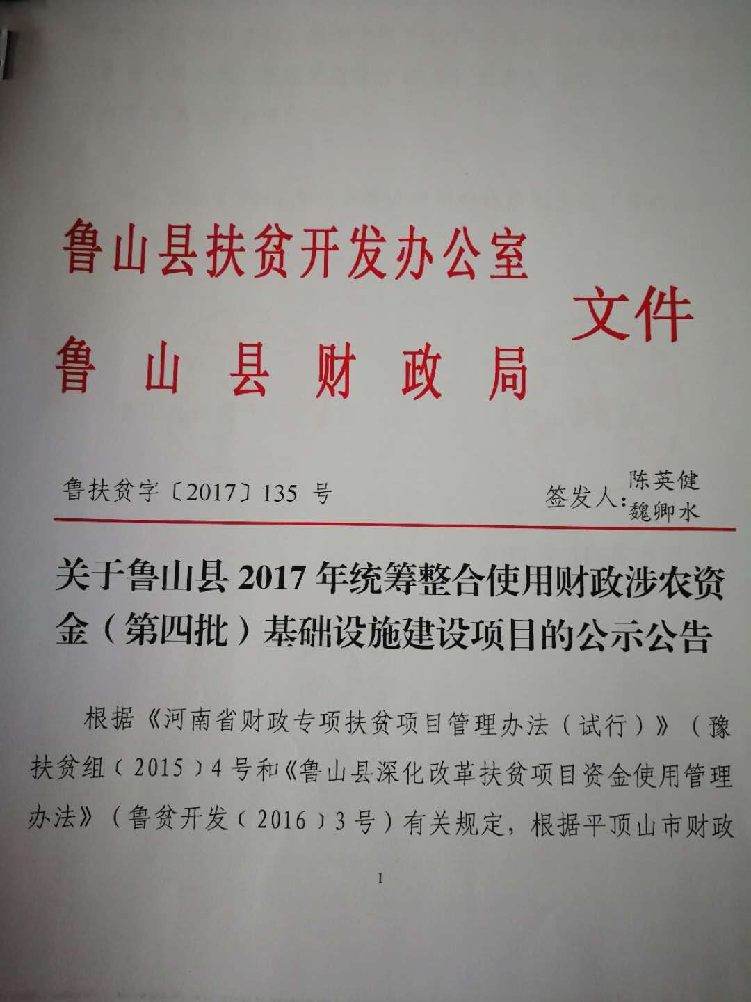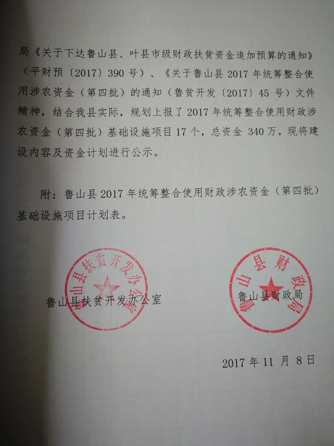 关于鲁山县2017年统筹整合财政涉农资金(第四批)基础设施建设项目的公示公告