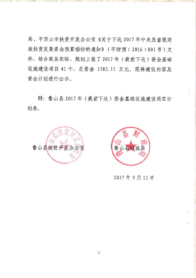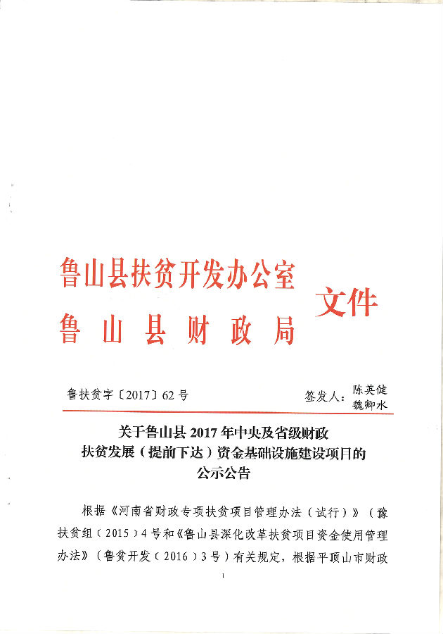 鲁山县2017年中央(二批)财政专项扶贫资金基础设施建设项目实施方案的公示公告(一)