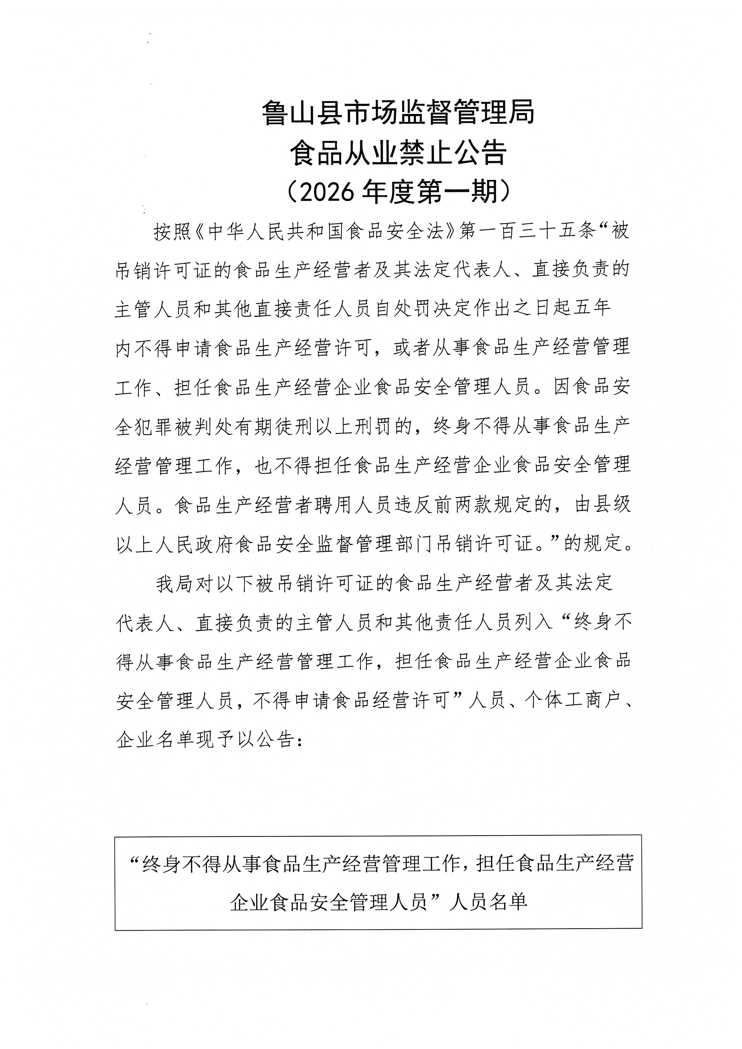 鲁山县市场监督管理局食品从业禁止公告(2026年度第一期)